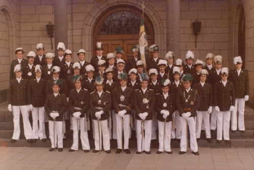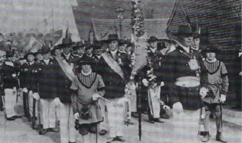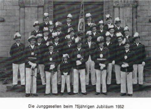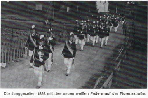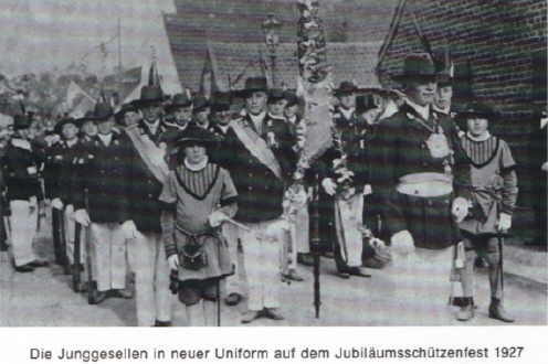 Im darauf folgenden Jahr erweiterten die Junggesellen ihre Uniform um Federn für die Hüte, Schützenabzeichen und Schleifen