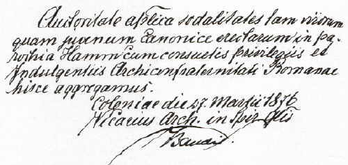 „Kraft apostolischer Vollmacht schließen wir die Sodalitäten, und zwar sowohl die Männer als auch die der Jungmänner, die (beide) in der Pfarrei Hamm kanonisch errichtet worden sind, mit den gewohnten Vorrechten und Ablässen der Römischen Erzbruderschaft an“
